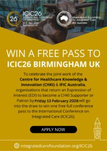 Organisations that submit an EOI to become a CHKI Patron or Supporter by Friday 20 February 2026 will go into the draw to win one free full conference pass (valued at $2,500) to the 26th International Conference on Integrated Care (ICIC26) – the world’s leading integrated-care conference.
