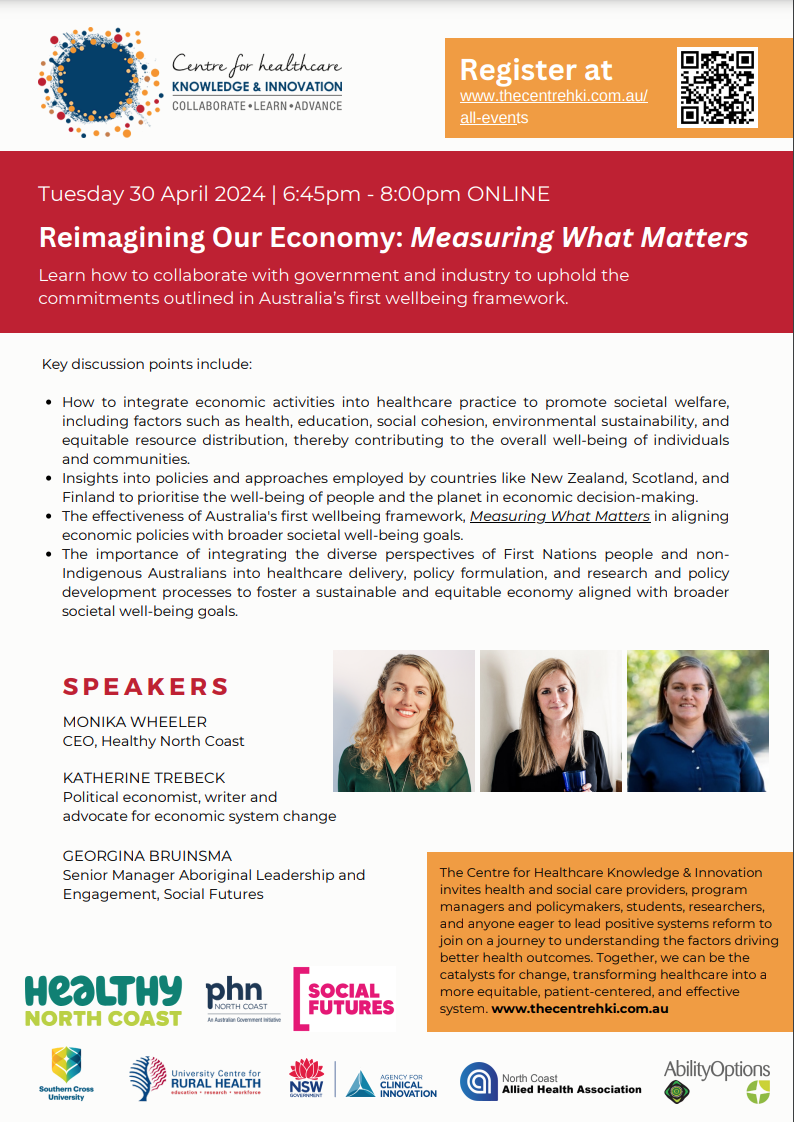 This webinar explored how the healthcare workforce can collaborate with government and industry partners in 2024 to uphold the commitments outlined in Australia’s first wellbeing framework – Measuring What Matters. It engaged Dr Katherine Trebeck, a respected political economist, writer and advocate who has long been working to change how people and policymakers think about and shape the economy. Key discussion points include: