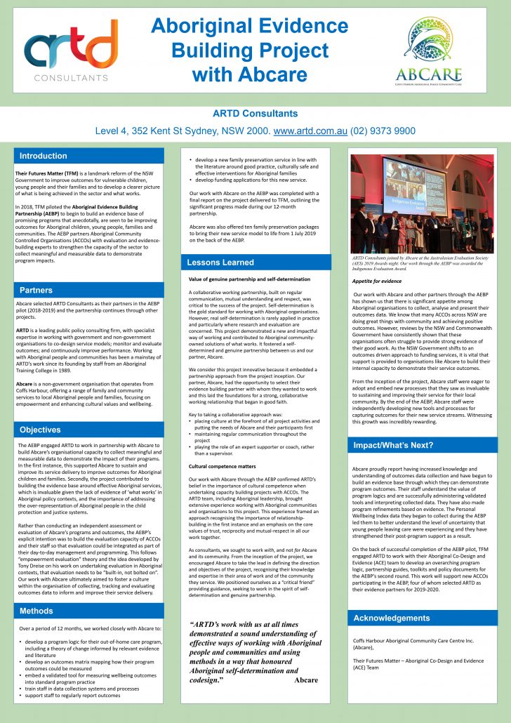 In 2018, TFM piloted the Aboriginal Evidence Building Partnership (AEBP) to begin to build an evidence base of promising programs that anecdotally, are seen to be improving outcomes for Aboriginal children, young people, families and communities. The AEBP partnered with ABCARE and evaluation and evidence building experts to strengthen the capacity of ABCARE to collect meaningful and measurable data to demonstrate program impacts.