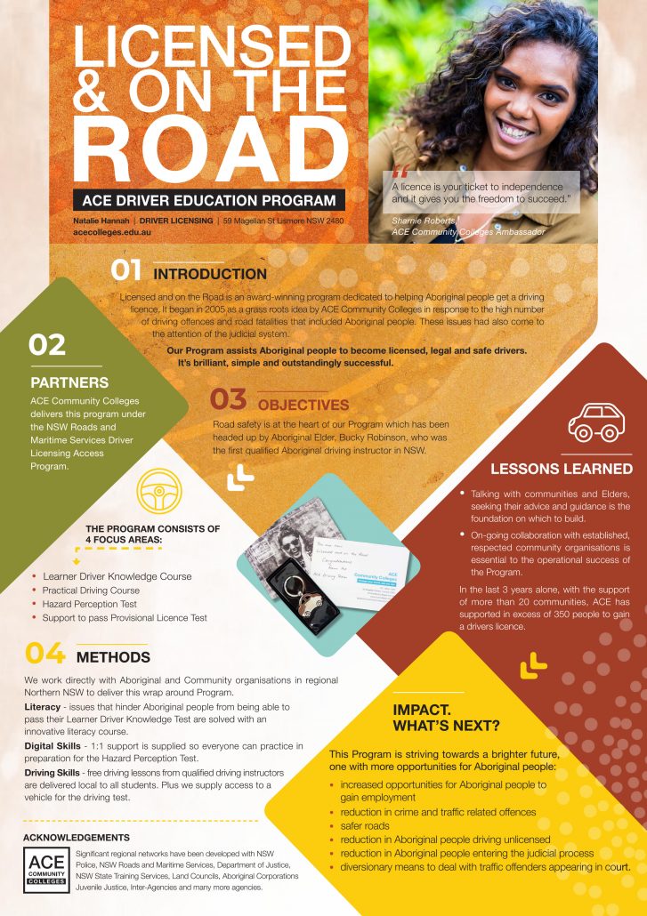 Licensed on the Road is an award-winning program dedicated to helping Aboriginal people get a driving license. It began in 2005 as a grass roots idea by ACE Community Colleges in response to the high number of driving offences and road fatalities that included Aboriginal people.