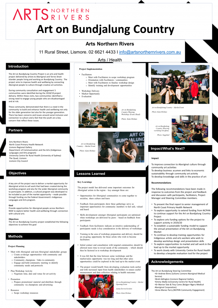 The Art on Bundjalung Country Project is an arts and health project delivered by artists to Aboriginal and Torres Strait Islander people living and working on Bundjalung Country. The project aims to improve health and wellbeing by connecting Aboriginal people to culture through creative art activities.
