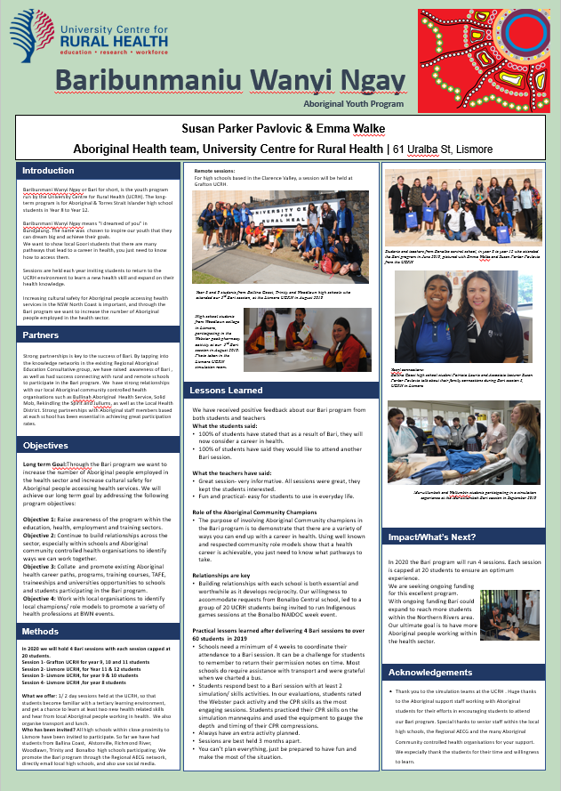Baribunmani Wanyi Ngay or Bari for short, is the youth program run by the University Centre for Rural Health (UCRH). The longterm program is for Aboriginal & Torres Strait Islander high school students in Year 8 to Year 12. The program shows local Goori students that there are many pathways that lead to a career in health, you just need to know how to access them.