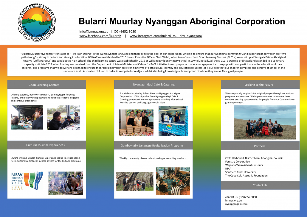 “Bularri Muurlay Nyanggan” translates to “Two Path Strong” in the Gumbaynggirr language. It thereby sets the goal of the corporation, which is to ensure that the local Aboriginal community , in particular youth, are “two path strong” – strong in culture and strong in education.