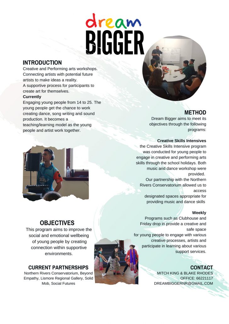 The Dream Bigger program aims to improve the social and emotional wellbeing of young people by creating connection within supportive environments, creative and performing arts.