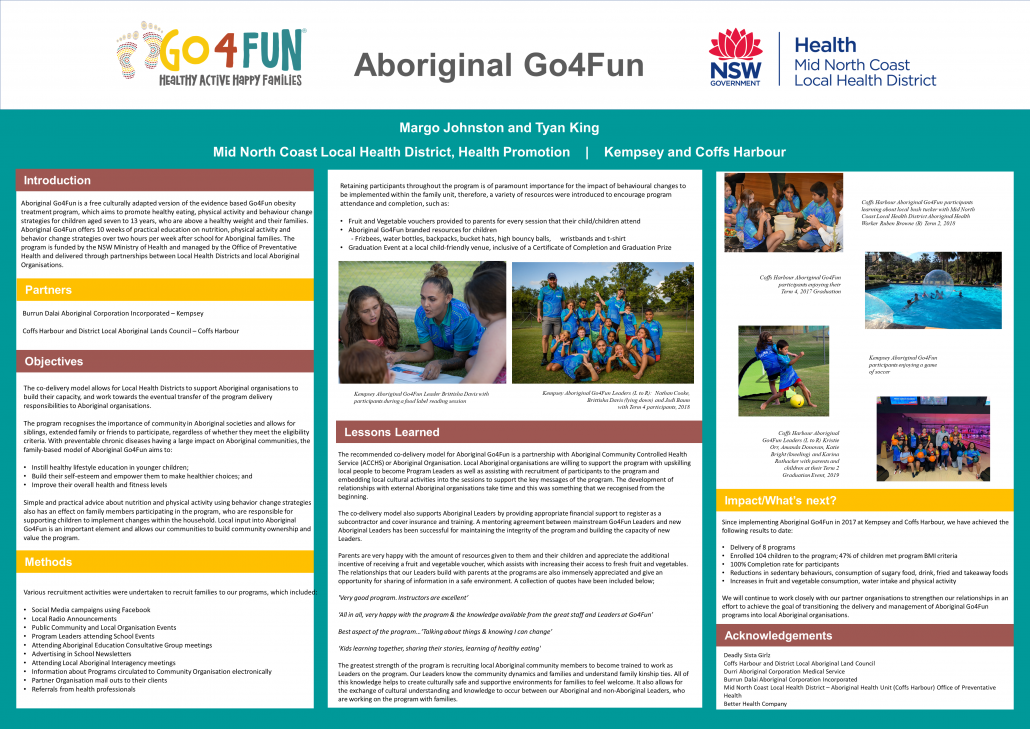 Aboriginal Go4Fun is a free culturally adapted version of the evidence based Go4Fun obesity treatment program, which aims to promote healthy eating, physical activity and behaviour change strategies for children aged seven to 13 years, who are above a healthy weight and their families. Aboriginal Go4Fun offers 10 weeks of practical education on nutrition, physical activity and behavior change strategies over two hours per week after school for Aboriginal families.