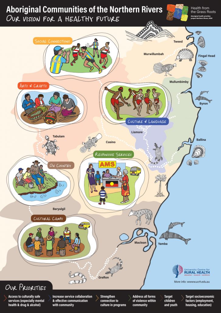 Health from the Grass Roots aims to give voice to local Aboriginal community members (living in Bundjalung and Yaegl country) from Tweed Heads to Grafton, about what they see as priorities for Aboriginal health and wellbeing. Aboriginal staff at the University Centre for Rural Health (UCRH) in the North Coast region are leading this work; gathering community ideas to inform service provision and research.