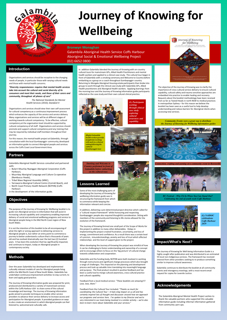 Journey of Knowing for Wellbeing is a mental health project at Galambila. It was established through consultation with the local Gumbaynggirr community and developed into an information guide to connect Aboriginal people and services across the Coffs Coast Local Government Area.