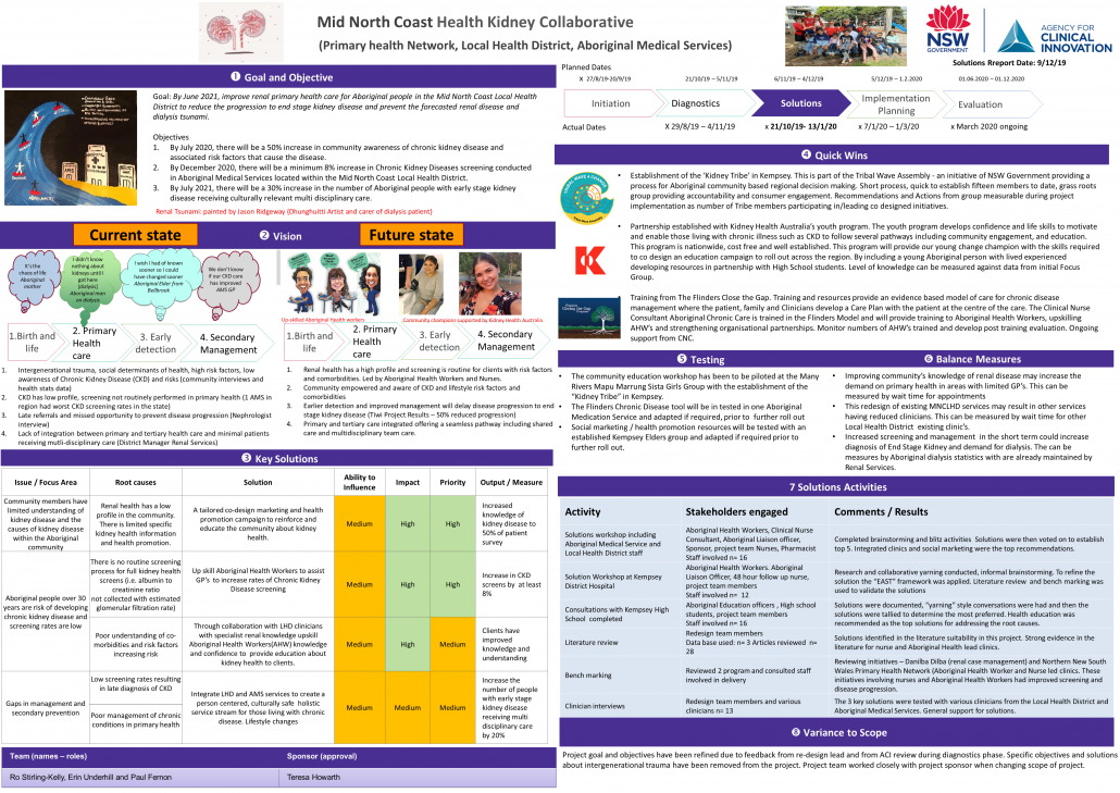 The goal of the Health Kidney Collaborative is to improve renal primary health care for Aboriginal people in the Mid North Coast Local Health District and to reduce the progression to end stage kidney disease and prevent the forecasted renal disease and dialysis tsunami.