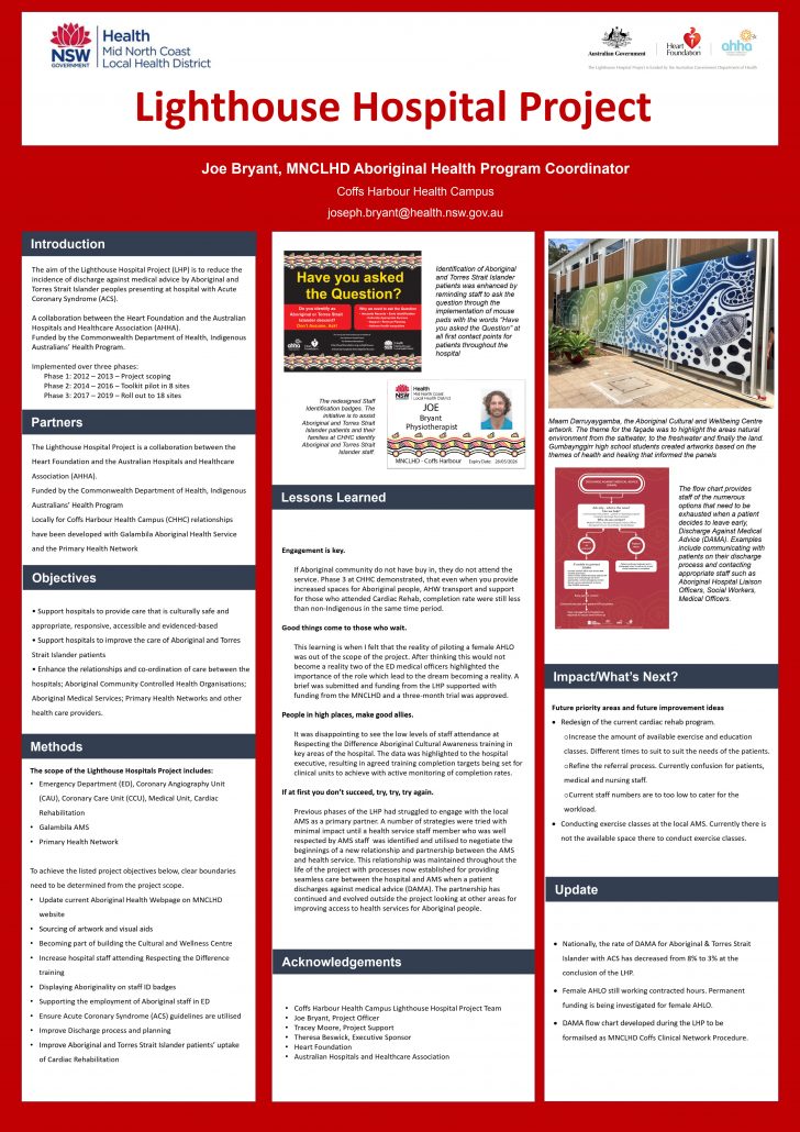 The aim of the Lighthouse Hospital Project (LHP) is to reduce the incidence of discharge against medical advice by Aboriginal and Torres Strait Islander peoples presenting at hospital with Acute Coronary Syndrome (ACS).