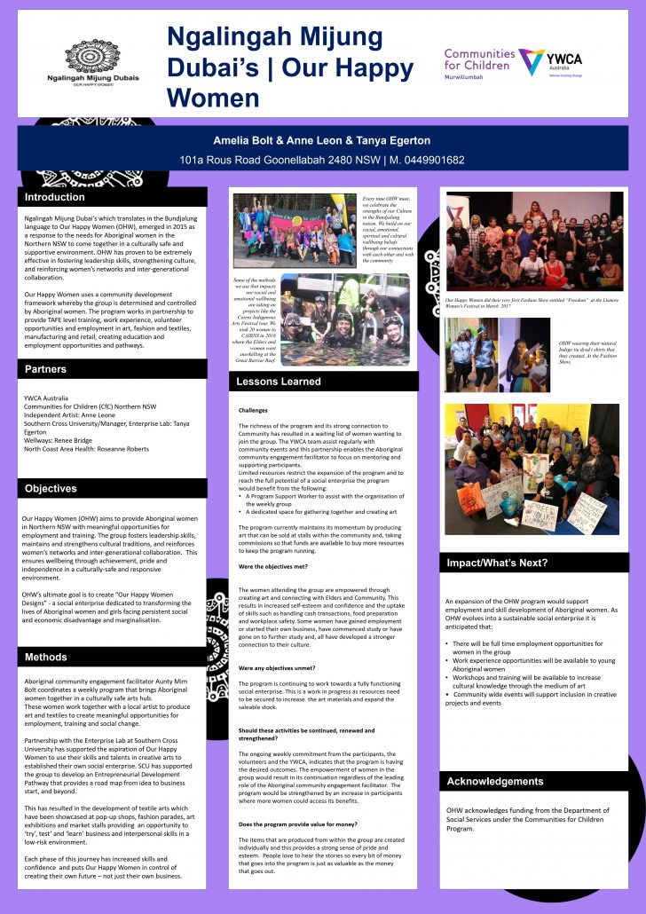 Ngalingah Mijung Dubai’s which translates in the Bundjalung language to Our Happy Women (OHW), emerged in 2015 as a response to the needs for Aboriginal women in the Northern NSW to come together in a culturally safe and supportive environment. OHW has proven to be extremely effective in fostering leadership skills, strengthening culture, and reinforcing women’s networks and inter-generational collaboration.