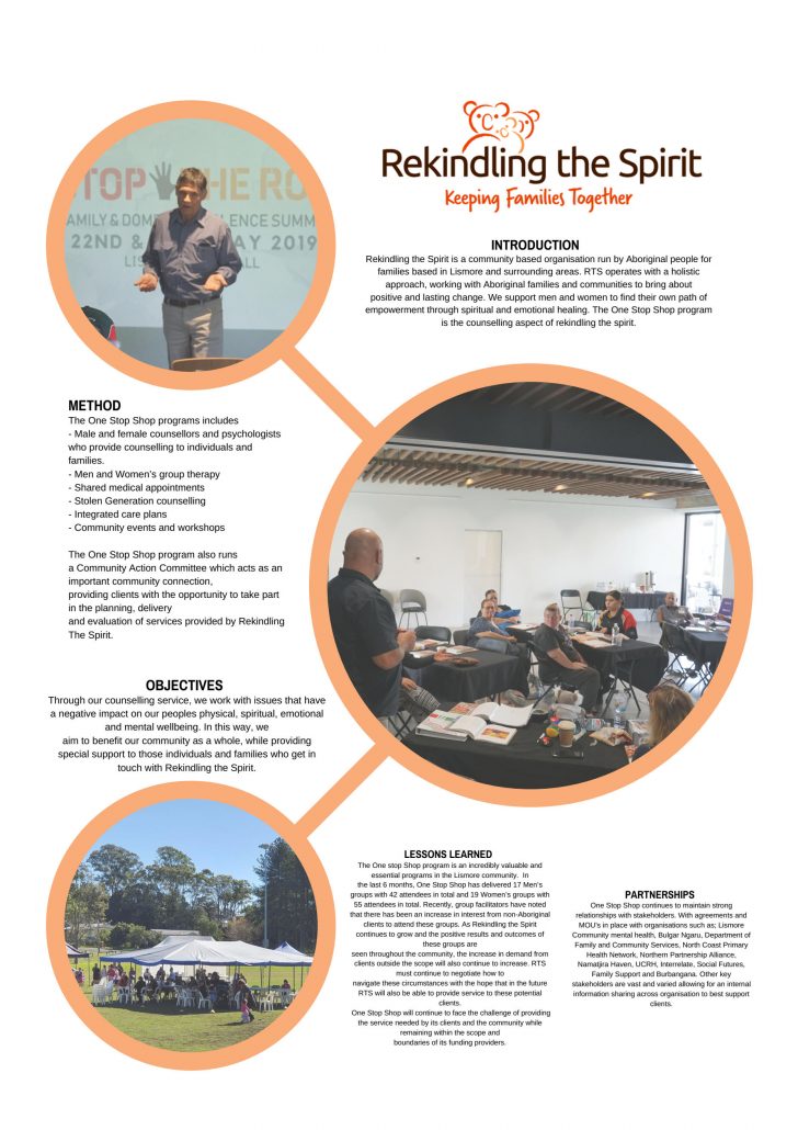 The One Stop Shop program is the counselling aspect of Rekindling the Spirit – a community based organisation run by Aboriginal people for families based in Lismore and surrounding areas. RTS operates with a holistic approach, working with Aboriginal families and communities to bring about positive and lasting change.