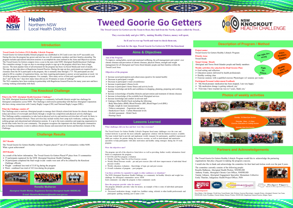 Tweed Goorie Go Getters healthy lifestyle program was established in 2012 and is now into its 8th successful year. During this time the program has grown and now has over 40 community members and their families attending. The program includes specialised education sessions to accomplish the aims outlined in the Aims and Objectives section.