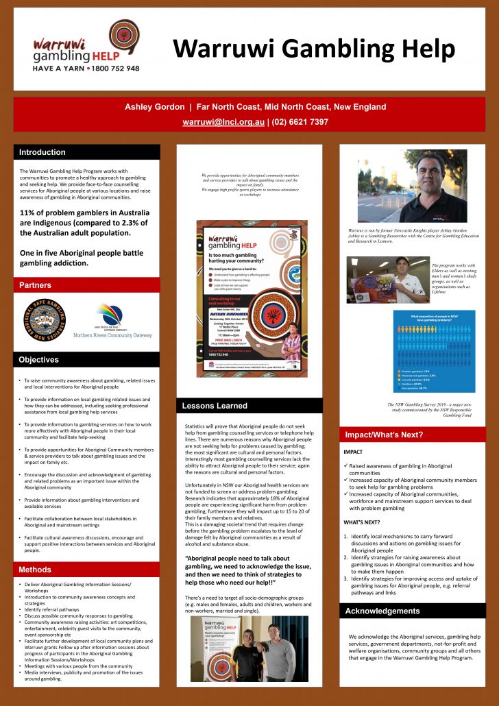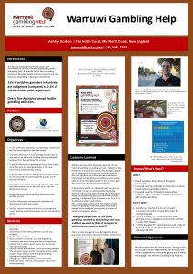 The Warruwi Gambling Help Program works with communities to promote a healthy approach to gambling and seeking help. We provide face-to-face counselling services for Aboriginal people at various locations and raise awareness of gambling in Aboriginal communities.